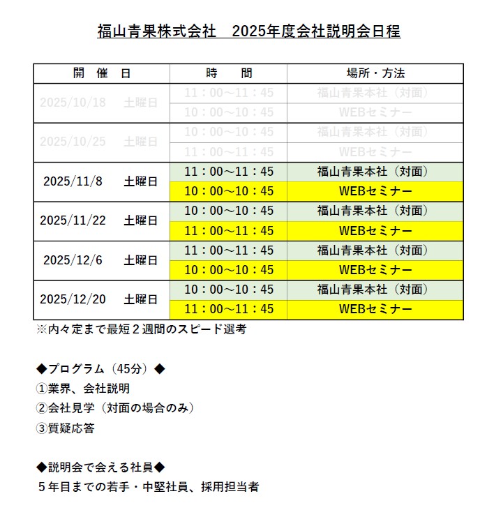 2025.11.07 採用情報 会社説明会11・12月日程 11・12月会社説明会の日程は下記の通りです。 食品関係、卸売業界にご興味のある方は是非、ご参加ください。 参加申込は当ホームページ内のエントリー/お問い合わせフォームからお申込み下さい お知らせの一覧に戻る